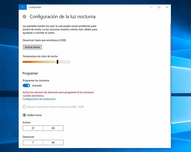 Windows 10 tiene una función de limitación de luz azul desde la Actualización de creadores de abril de 2017 llamada Luz Nocturna, que cambia la visualización para que solo muestre colores más cálidos. Aquí tienes los pasos para activarla: