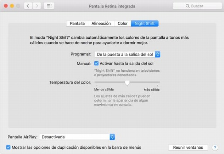 Los usuarios de Apple tienen la posibilidad de limitar su exposición a la luz azul mediante el uso de una función llamada "Cambio nocturno", que se presentó a los sistemas MacOS en la actualización MacOS Sierra de marzo de 2017. A continuación, te indicamos cómo activar esta excelente función: