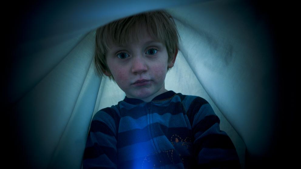 Un niño se alumbra con una linterna bajo las sábanas de la cama (Heath Korvola - Getty)