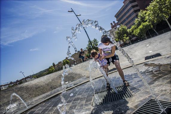 Una madre aproxima a su hija a una fuente (Xavier Cervera)