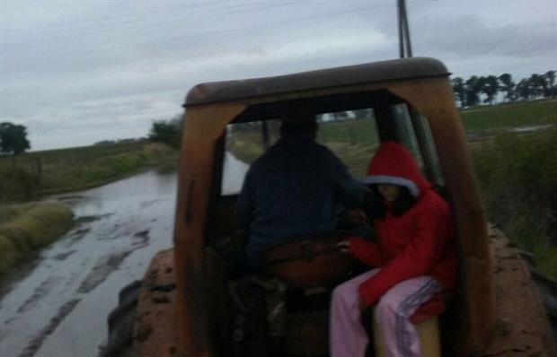 En Guarda Vieja, cerca de Laboulaye, el tractor se usa para pasar por caminos inundados y llegar hasta la escuela rural. Foto: Gentileza Escuela de Guardia Vieja