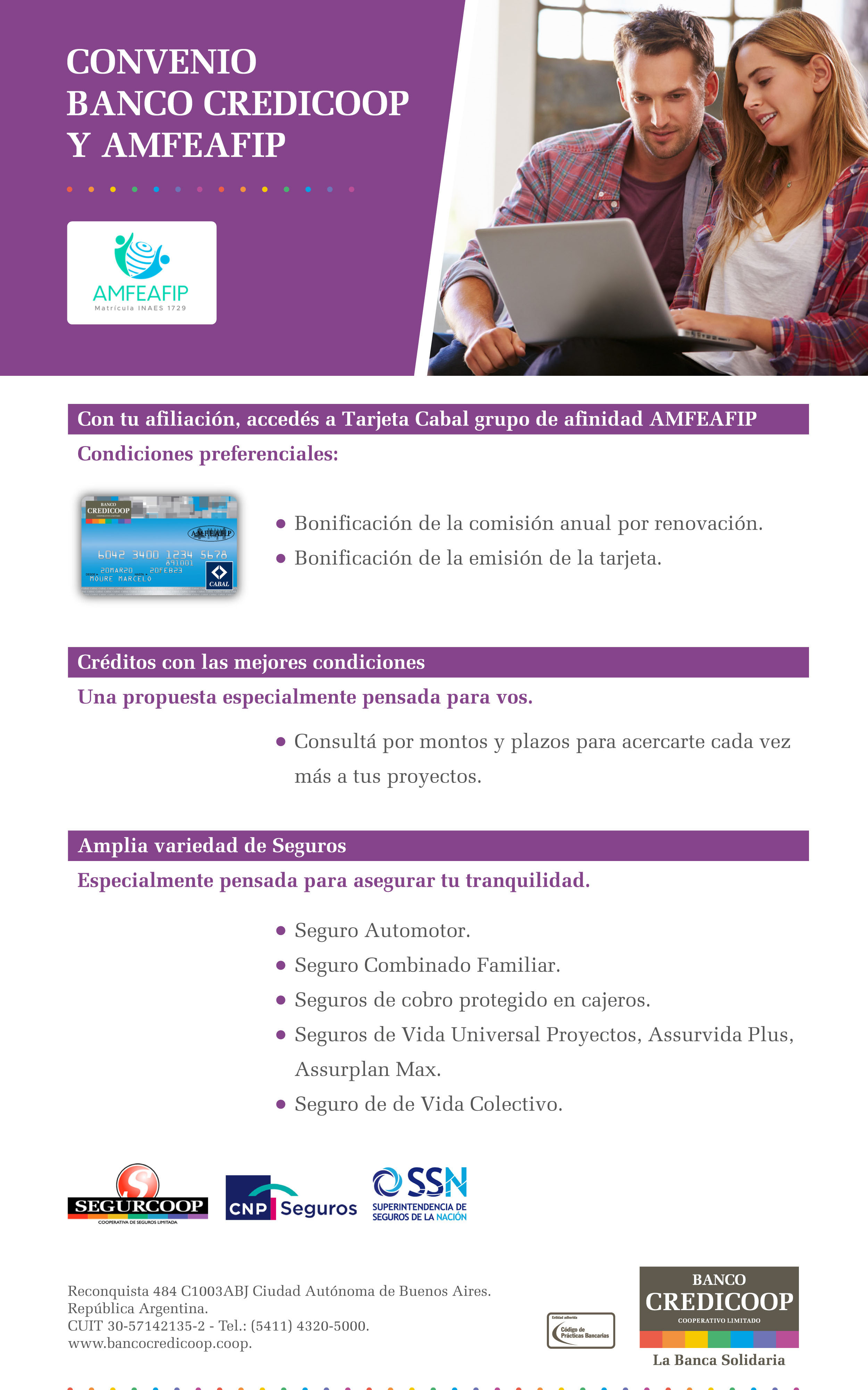 Antes vale resaltar que en este tipo de prestaciones es fundamental operar con instituciones sólidas que ofrezcan no sólo buenas condiciones de contratación sino y fundamentalmente, CONFIANZA en el cumplimiento de sus obligaciones. En este sentido, tanto la AMFEAFIP con sus más de 30 años de trayectoria, como el Banco Credicoop –en su calidad de entidad líder en el financiamiento de Pymes y entidades de la Economía Social-, ofrecen el respaldo necesario como para realizar este tipo de operaciones.