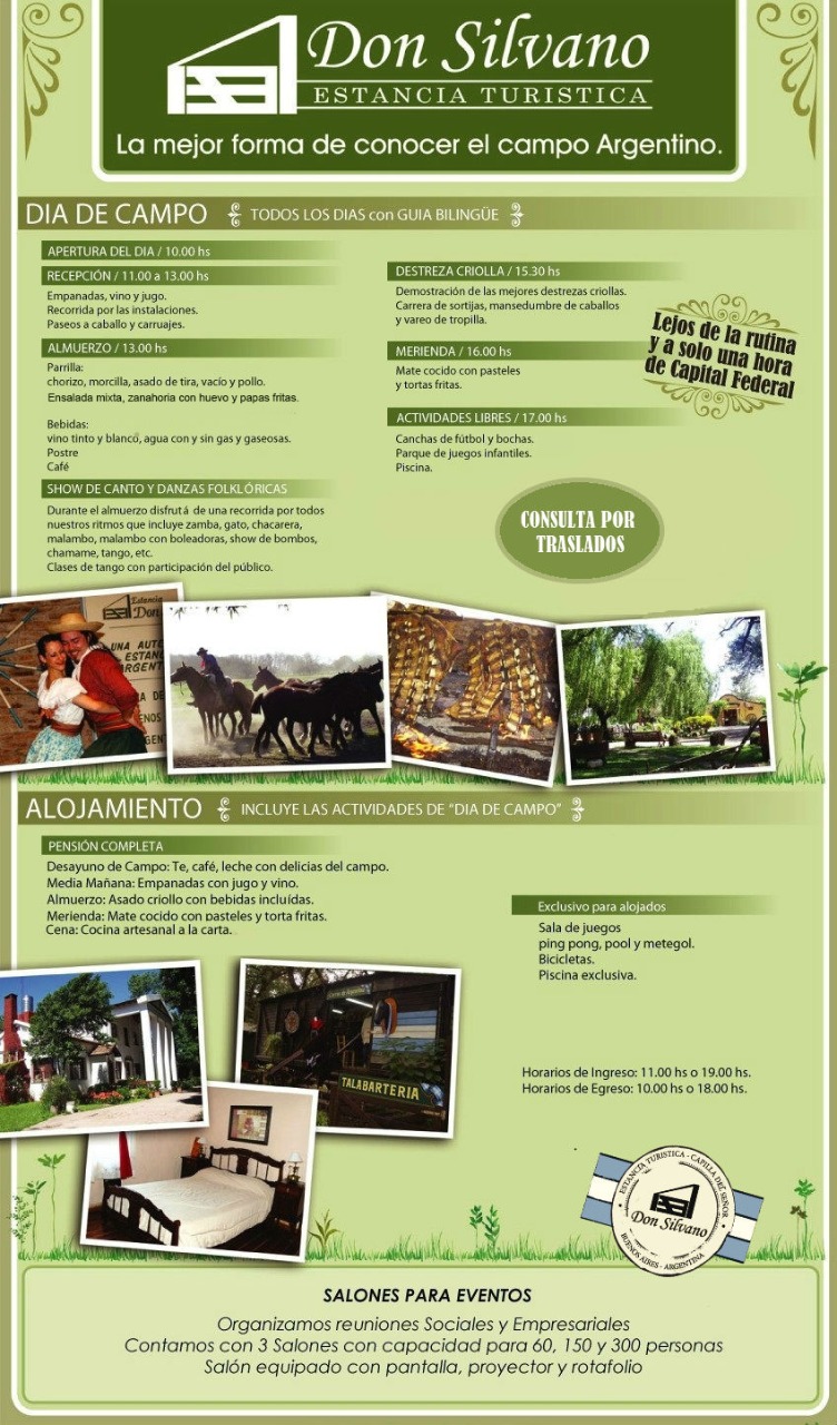 Un dia de Campo con recepcion, almuerzo, meriednas durante la tardecita. y con la opcion de hacer multiples actividades como estadia en pileta, pesca, equitacion, navegacion en botes a traves de canales propios, deportes como Voley y Futbol, y actividades de aventura como palestra, tirolesa para adultos, tirolesa para niños y parque aéreo.