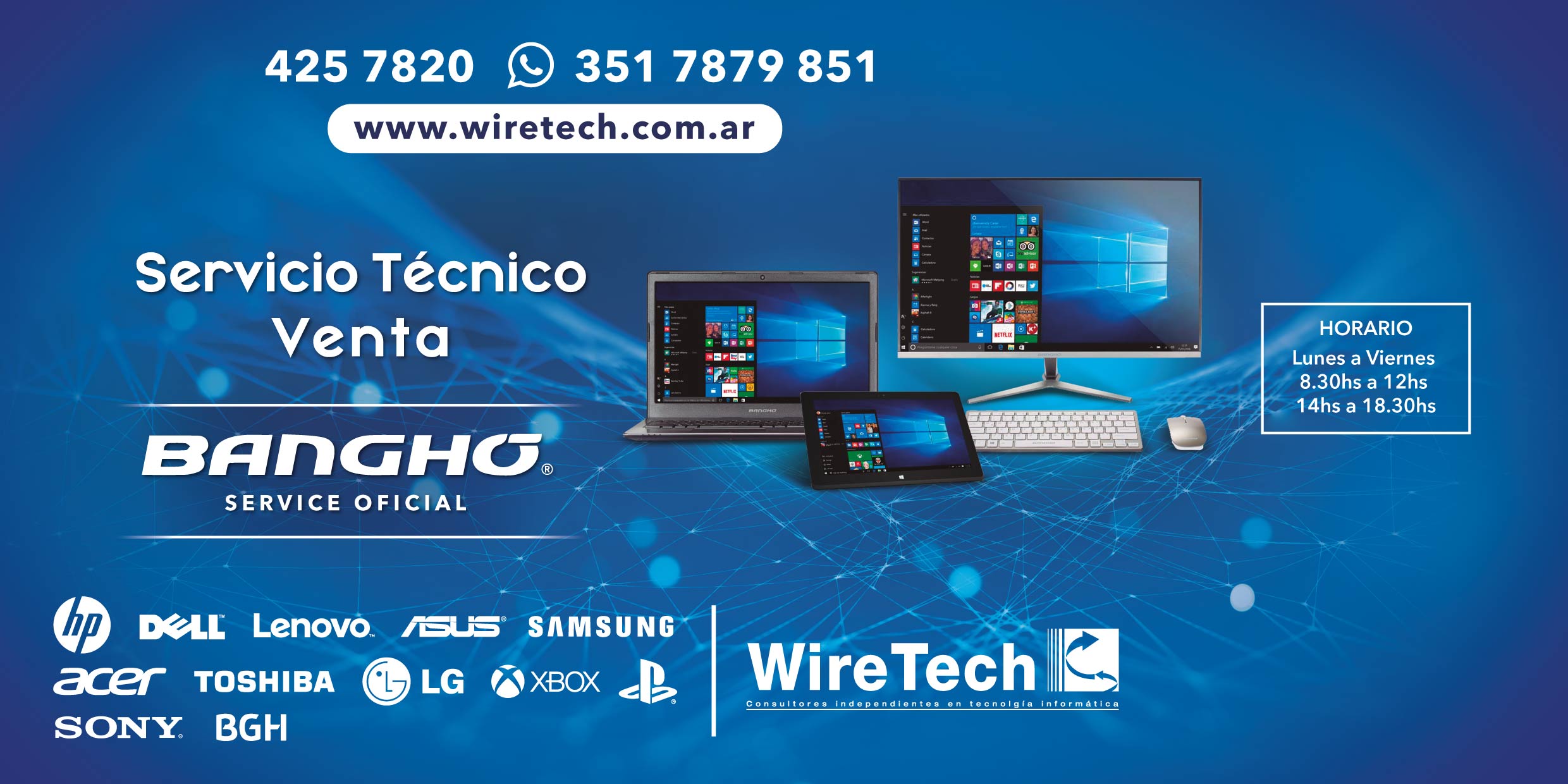 Wiretech Consultores independientes es una compañía de servicios informáticos que cuenta ya con mas de 10 años de experiencia en el rubro. Con una amplia trayectoria en la industria informática de Córdoba. Único service oficial de Bangho en la provincia.