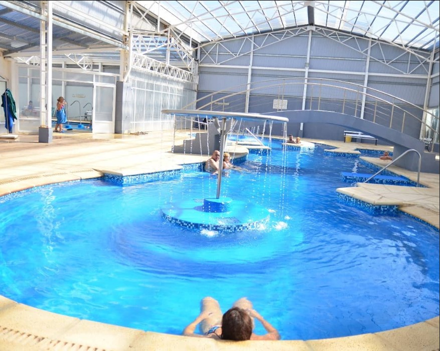 El complejo cuenta con piscinas de diferentes temperaturas y usos: dos son de uso pasivo con hidrojets (una de ellas semicubierta y con chorros para las cervicales);